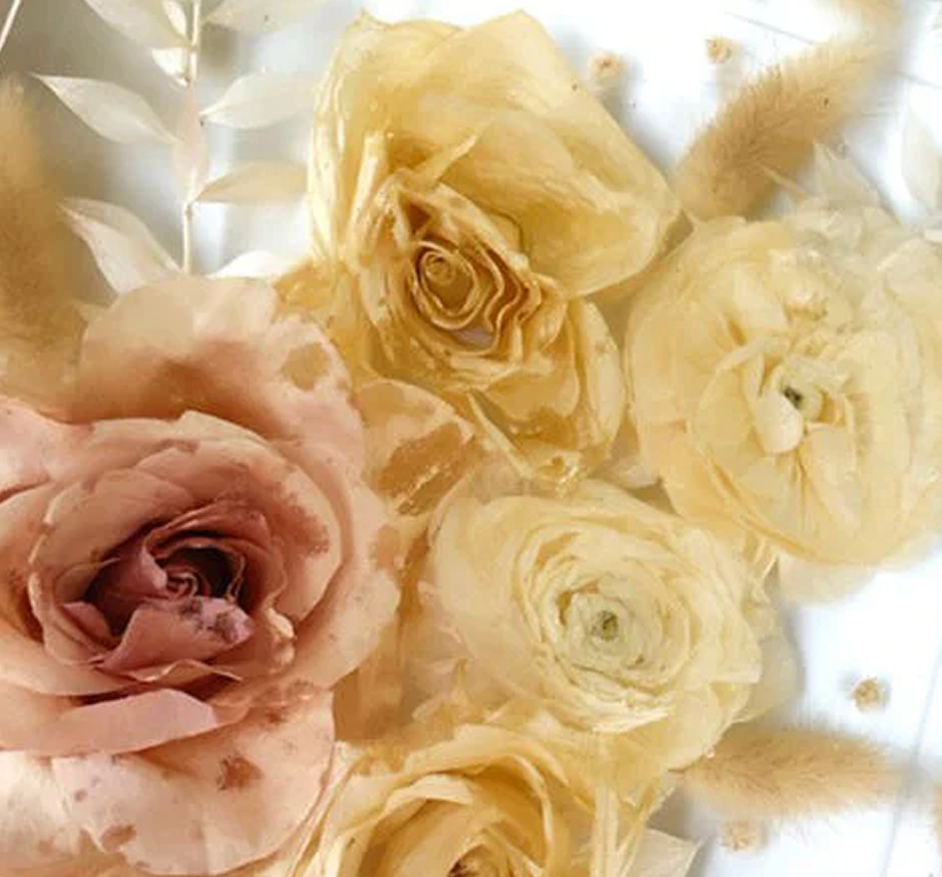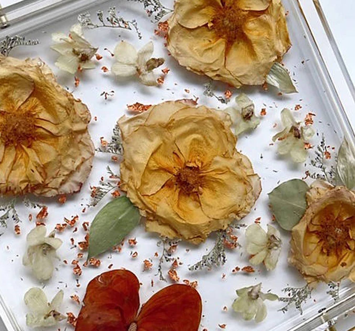 Before we begin crafting your resin keepsake, every flower must be completely dried. Moisture is incompatible with resin and can lead to decay, discoloration, or even rotting over time — compromising both the look and integrity of your piece. We use silica gel drying to gently extract moisture while helping flowers retain as much of their original shape and color as possible. That said, natural changes may still occur: