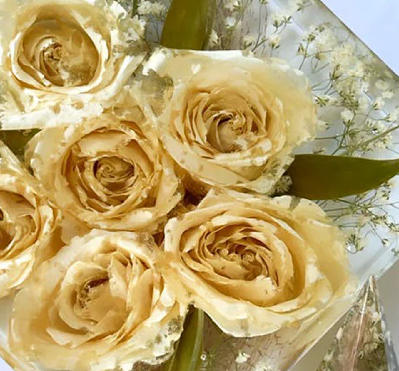 Bruising refers to translucent spots that sometimes appear after resin is poured over flowers. This is particularly common in roses, tropical varieties, and lighter-colored blooms. Rest assured, these are not holes — but rather natural reactions as petals interact with resin. While some clients embrace these subtle textures as part of the flower’s preserved character, others may prefer a more flawless appearance. In those cases, we recommend our color enhancement service, which helps minimize bruising and enrich the vibrancy of your flowers.