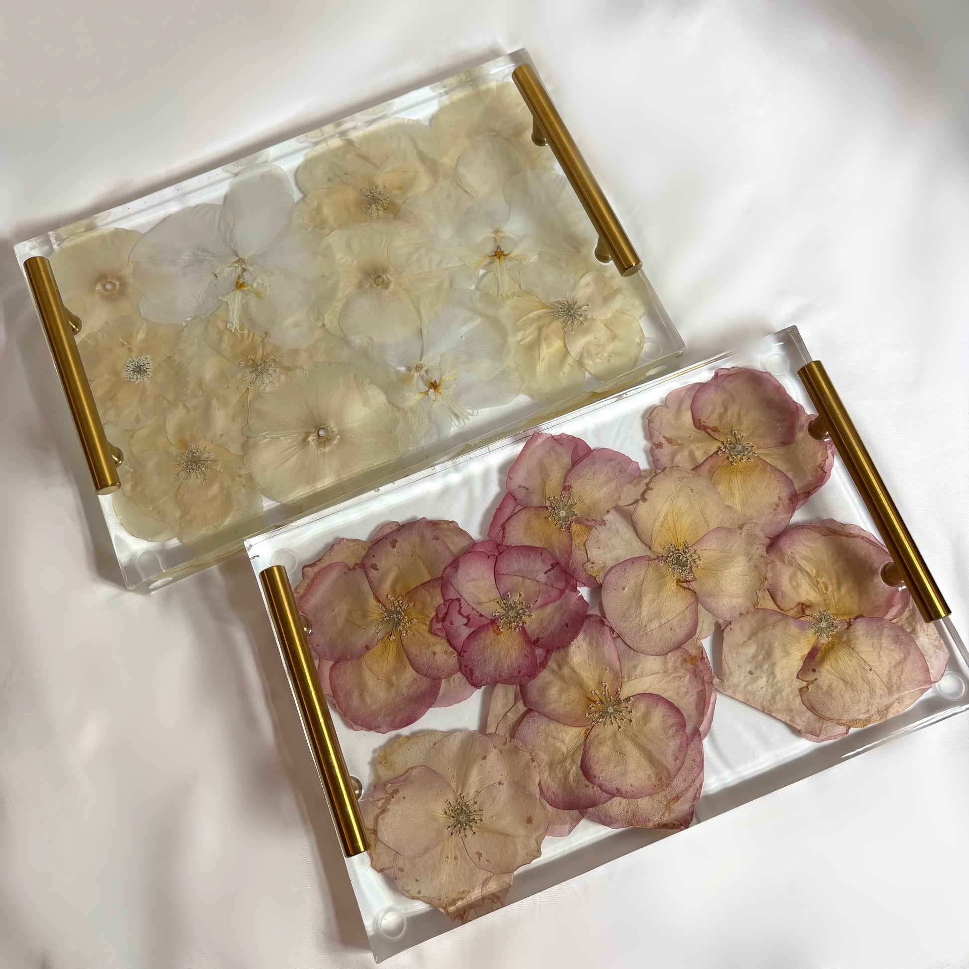 Our resin trays with flowers feature a unique floral preservation technique, where each flower is carefully pressed and dried to maintain its natural beauty. Please note that while we strive to incorporate every flower you send, we cannot guarantee it due to the drying process. Every bloom is handcrafted with care, and we design each piece according to the flowers' unique characteristics as they dry, ensuring a truly personalized experience.